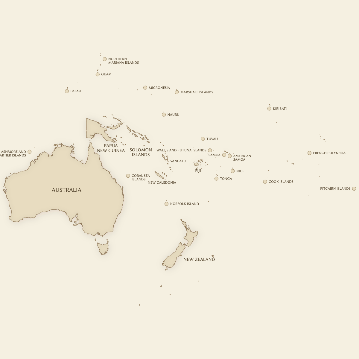 Create a personalized map of Oceania divided by countries, perfect for anyone looking to print or further extend their maps and export them in high-resolution PNG and SVG formats, making it suitable for both professional presentations and educational uses.